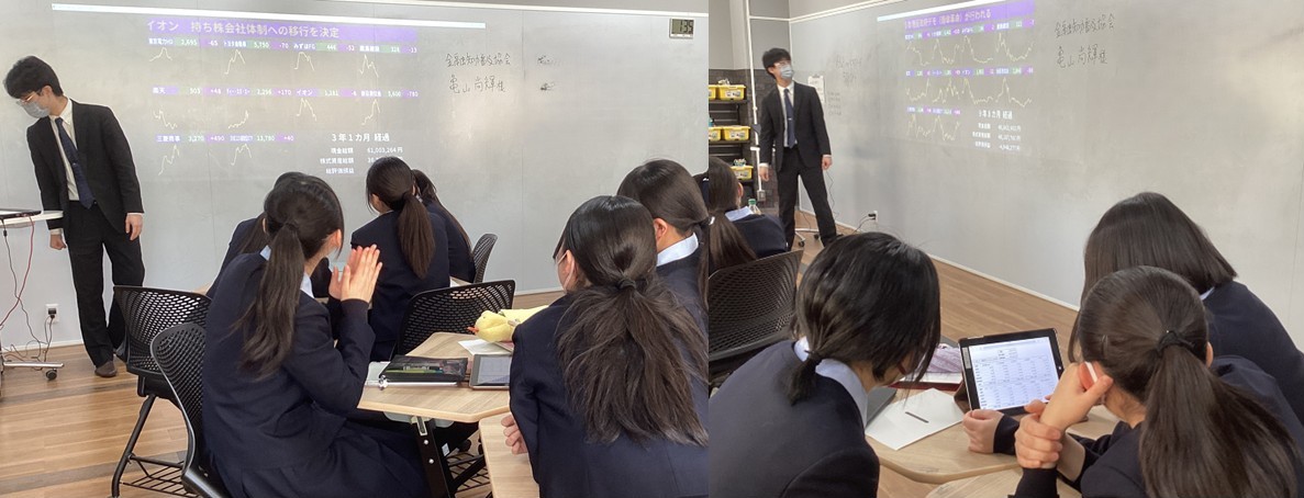 参加者は高校1年生の4クラスで、3人~4人が1チームとなり、モニターに表示されるニュースや、株価の上下を参考に、投資を行いました。